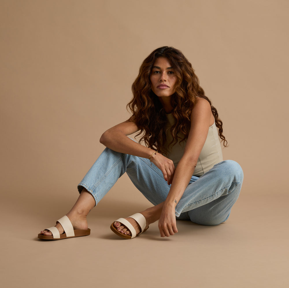 Let the people decide … and they did. Customers rave over our classic. understated-but-over-achieving Cushion Vista. It features our most comfortable footbed. made with PU that creates a soft feel but with supportive rebound. generous arch support. and heel cupping. That means all-day ahhhh. Two incredibly soft. PVC-free vegan leather straps hold your foot in style and your budget in check.