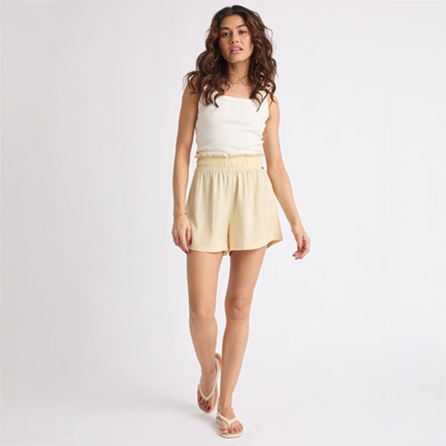 These easy pull-on shorts feature an elasticated waistband with paperbag details. The Ellie short has yarn-dyed stripes woven into the soft. drapey fabric. With a 3 inseam and relaxed fit. they’re your perfect companion for breezy days by the water or casual strolls around town.